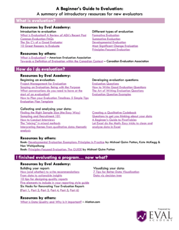 Designed for newcomers to the field, this one-page infographic summarizes foundational concepts and links to introductory Eval Academy articles and tools.
