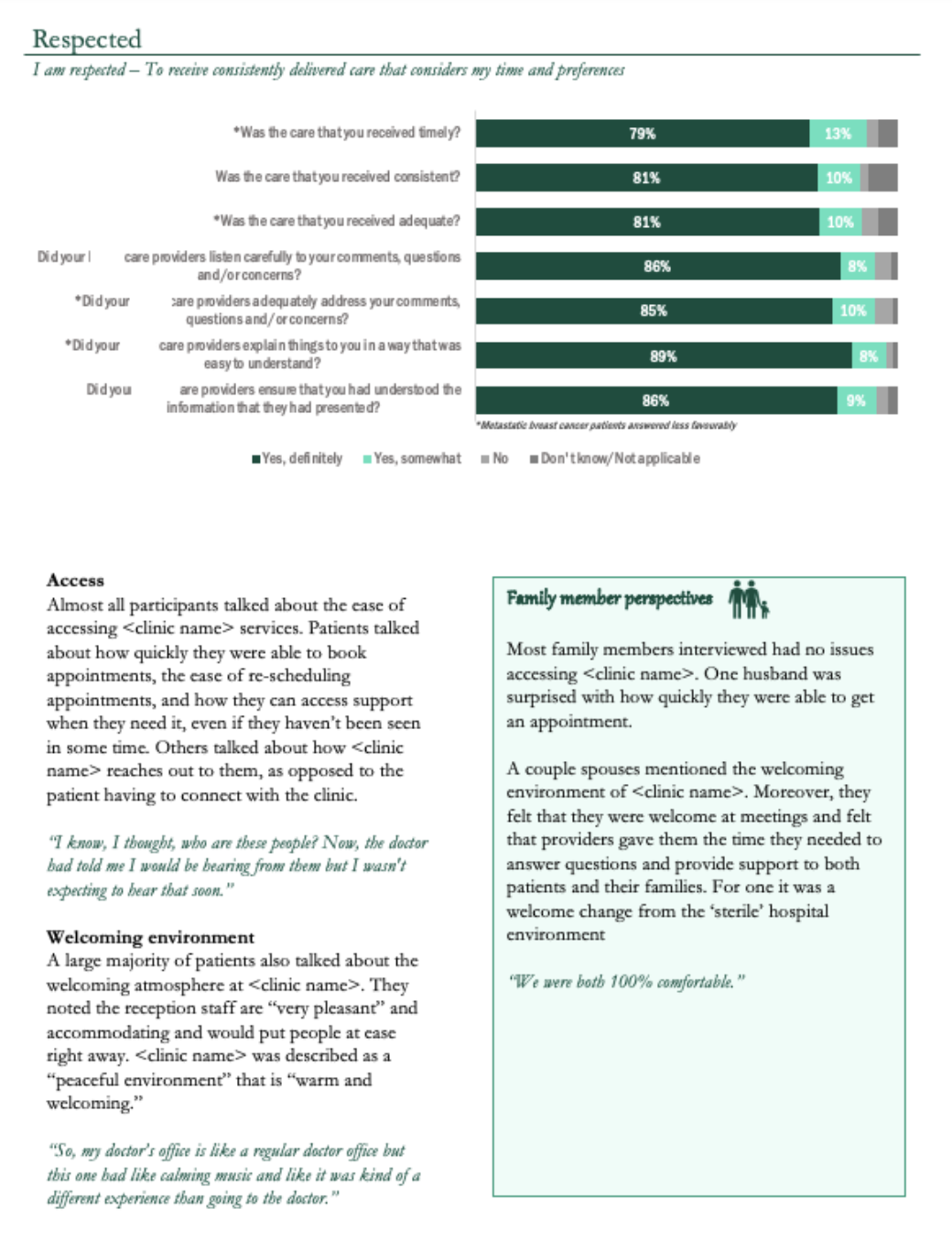 We collected survey data and interview data from patients and family members. We wanted to present that information in a cohesive way instead of using headings like “patient survey findings,” “patient interview findings,” and “family interview findings.” Instead, we used the Canadian Partnership Against Cancer’s pillars of a positive patient experience to frame how the results were reported.