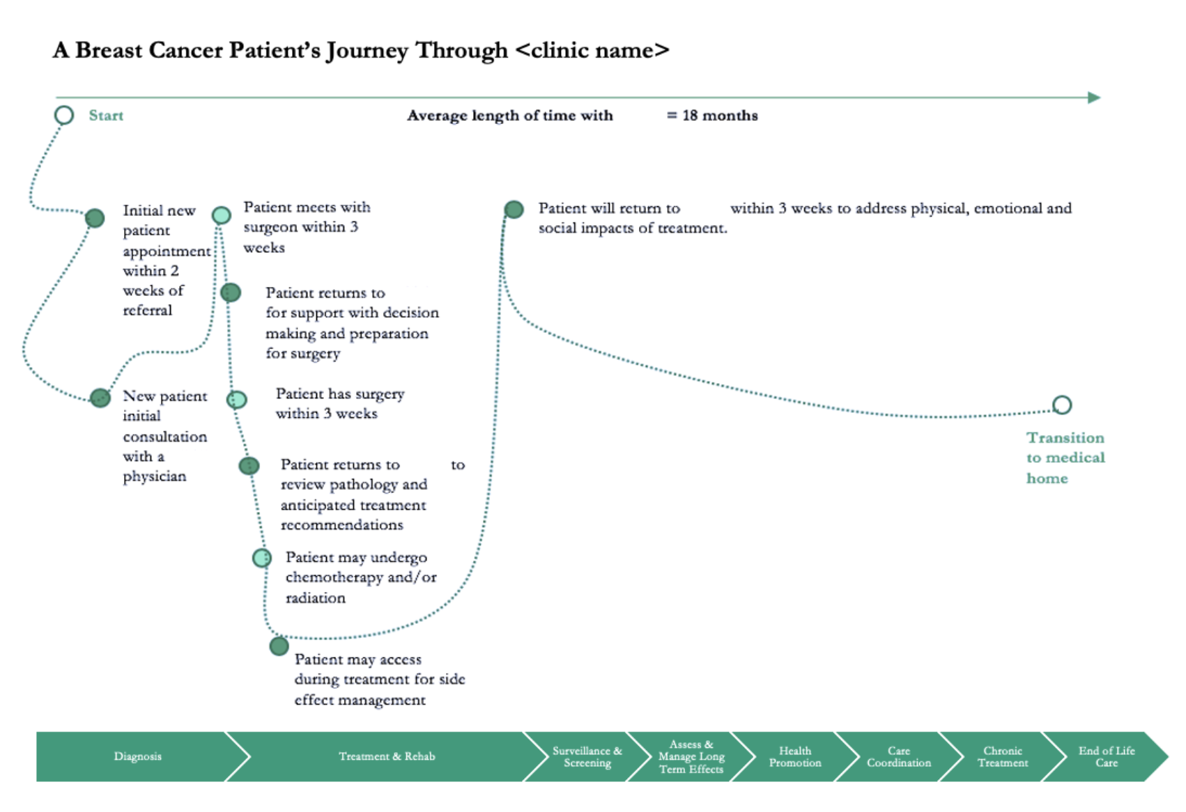 This figure was created using PowerPoint and shows a breast cancer patient’s journey and the clinic’s role in that journey.