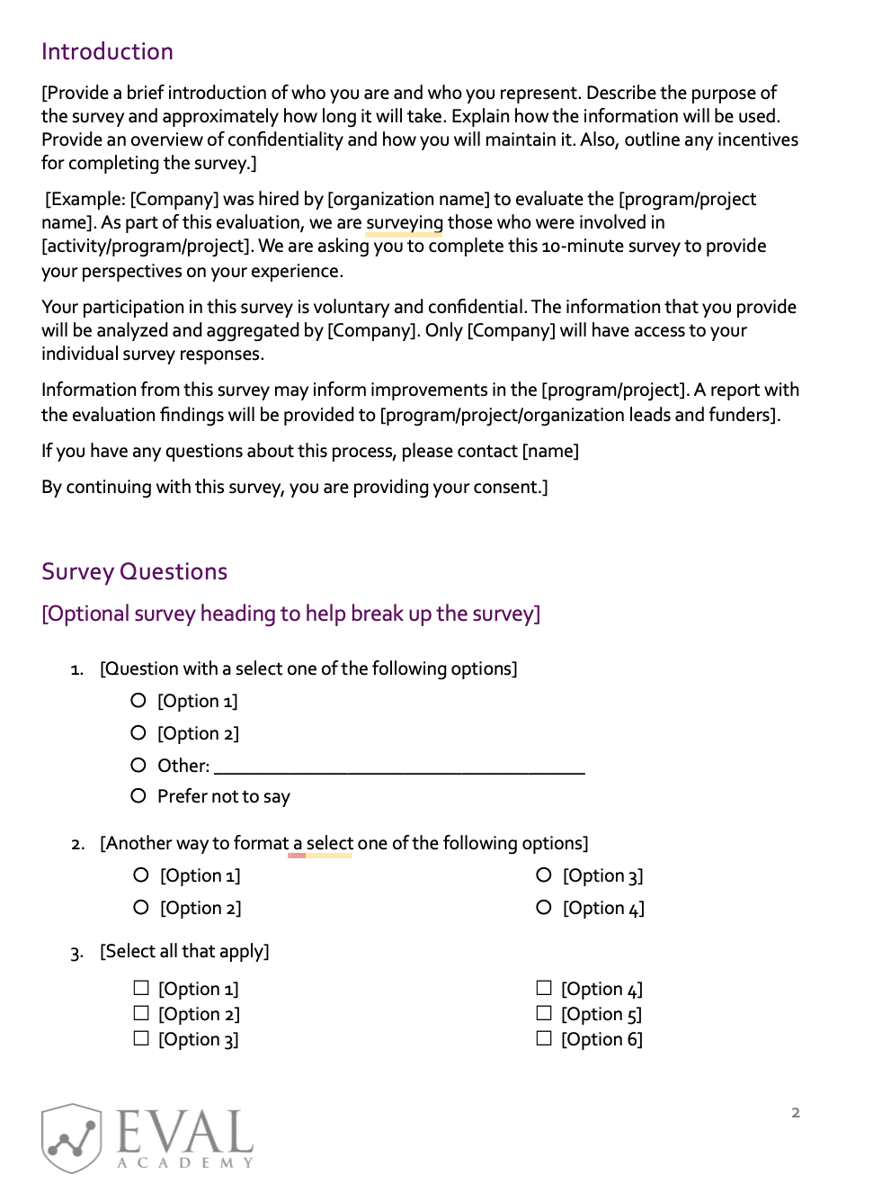 A customizable introduction section – Outline the purpose, confidentiality, consent, and survey length.