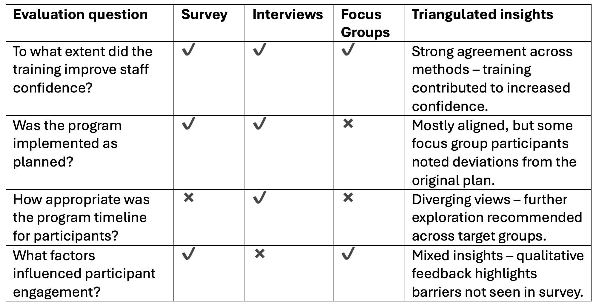 A triangulation matrix is a practical tool that helps evaluators assess how different data sources contribute to answering key evaluation questions. Rather than presenting findings in isolation, this visual format brings together evidence from multiple methods, making it easier to compare, contrast, and synthesize insights. For example: